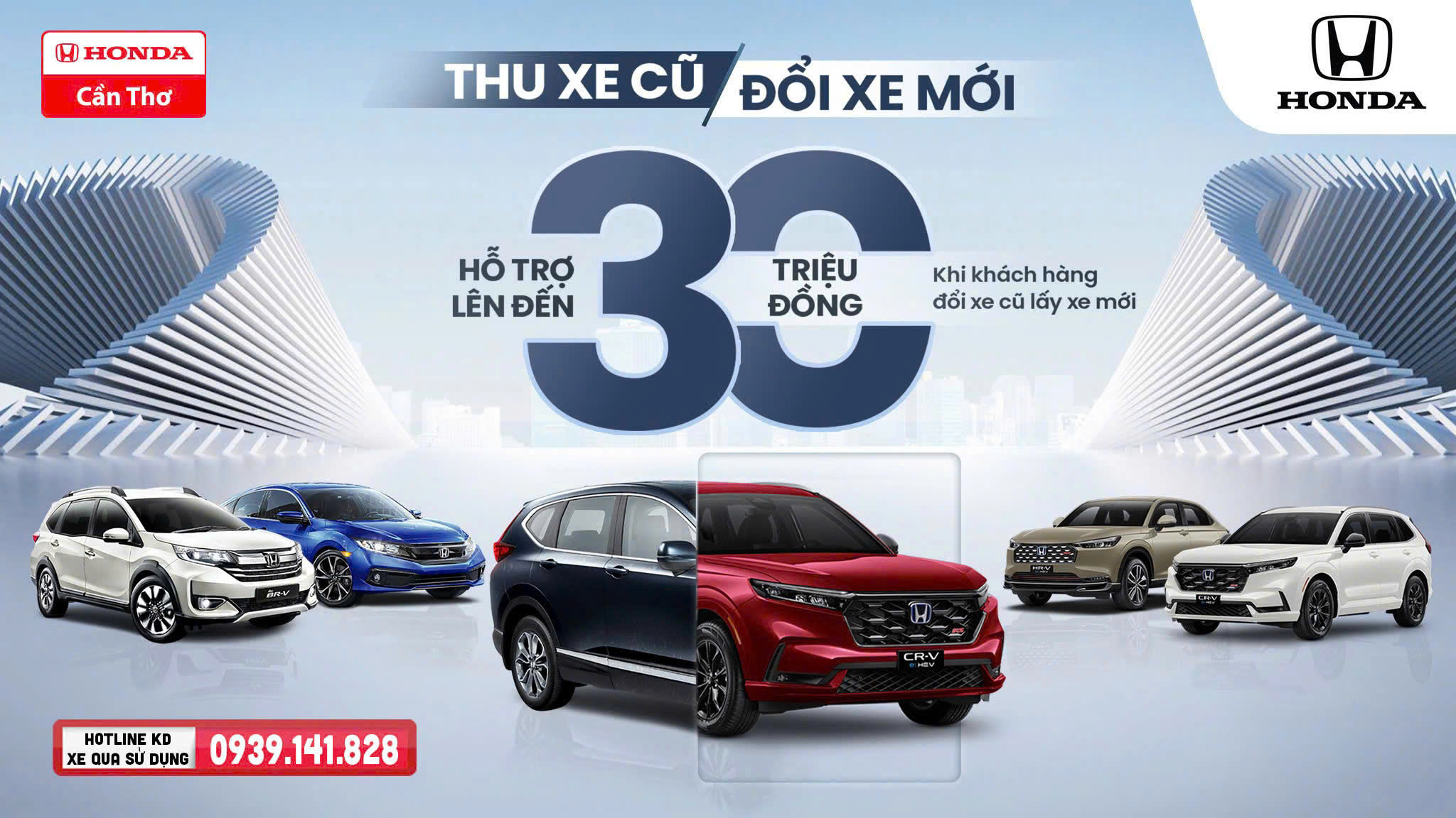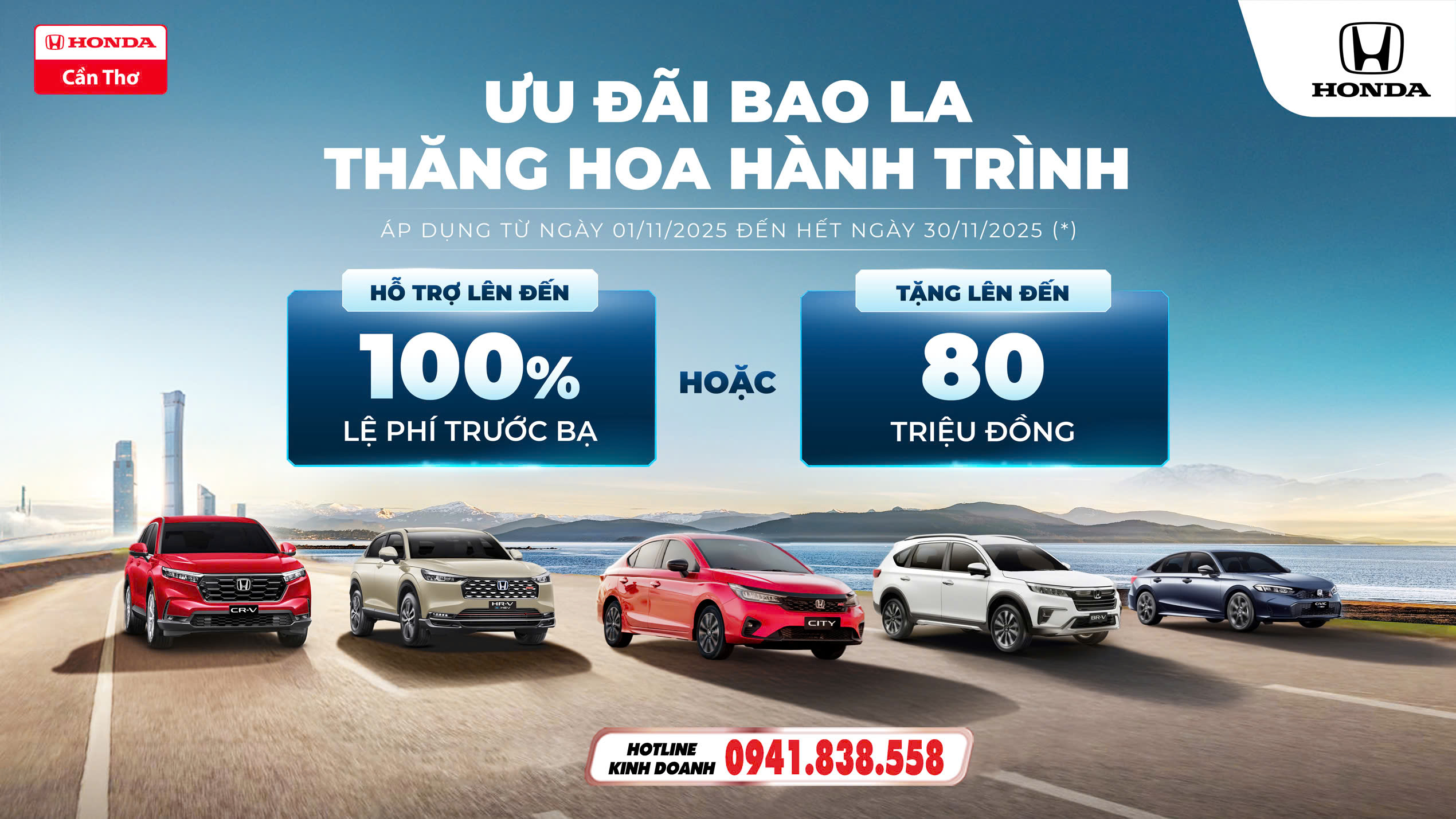 Chào đón năm mới, với mong muốn mang đến nhiều hơn nữa cơ hội trải nghiệm các mẫu xe ô tô Honda và tận hưởng những khoảnh khắc du ngoạn tuyệt vời cho Khách hàng, Honda Việt Nam (HVN) phối hợp cùng Honda Ôtô Cần Thơ triển khai chương trình khuyến mại hấp dẫn từ ngày 01 tháng 02 năm 2025 đến hết ngày 28 tháng 2 năm 2025 cho các xe VIN2024: Honda CR-V, Honda City, Honda Civic, Honda BR-V, Honda HR-V, Honda Accord.